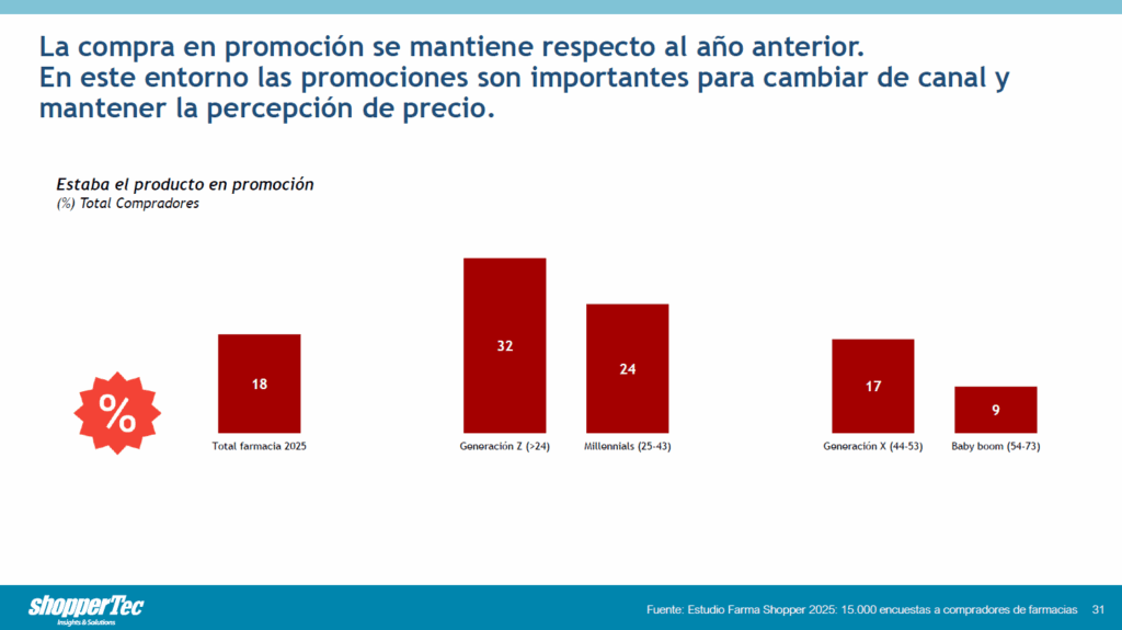 En el conjunto del canal farmacia, solo en el 18% de las compras realizadas el producto estaba en promoción. Es decir, las promociones están presentes, pero forman parte de una minoría de las decisiones de compra.
